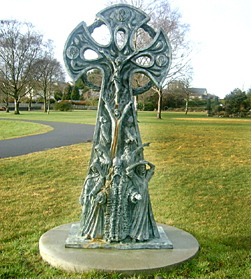 Our Lady of Knock Cross - This vision of Our Lady of Knock with John and Joseph at ther sides, cross is made up of feveral famous Irish Saints: Patrick, Brendan, Bridid of Kildare, Kevin and Columkill. The crucifixion is depected above with symbolic medallions of Matthew, Mark and Luke at the three corners of the cross. These corners are joinded by a ring of angels appearing as links in a Celtic chain, a symbol of eternity.