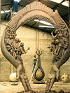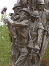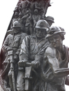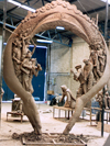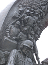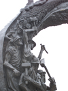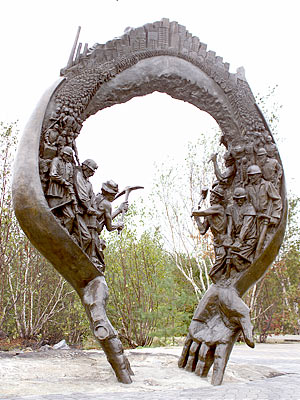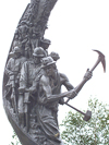 Situated in Bell Park overlooking the bay in the mining capital of Canada, Sudbury, Ontario, one of the largest exporters of nickel stands this impressive monument towering over fifteen feet tall that celebrates the history of mining. This sculpture is a tribute to miners from the first prospector and bare-chested old timers with their picks and axes up to modern day miners with sophisticated equipment. This sculpture is two sided with the back representing the past with two historic miners looking forward to the front of the monument that depicts the present and future of mining. Literally hundreds of miners descend on both sides of the sculpture and their collective work merges into two giant hands extracting what lies beneath the earth’s surface.